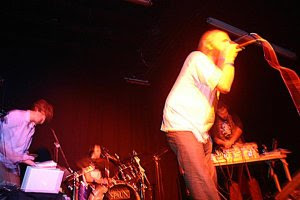 A little after 11 the SkyRider band began an opening set without Sole, and frankly, I'm glad they did. It was a great post-rock set, really spacey, filled with heavy beats and soaring violin, almost like a happy marriage between the post-rock styles of a Mogwai and a bit heavier, beat-driven sound like 65daysofstatic, but without the industrial influences. It was a solid set, and I was engaged in their music.